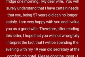 A wife finds a note from her husband on the fridge one morning.. My dear wife,. You will surely understand that I have certain needs that you, being 57 years… Read more