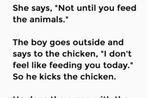 A boy asks his mother for breakfast. She says, “Not until you feed the animals.” The boy goes outside and says to the chicken, “I don’t feel like feeding you… Read more