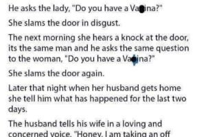 A woman is at home when she hears someone knocking at her door. She goes to the door opens it and sees a man standing there. He asks the lady,… Read more